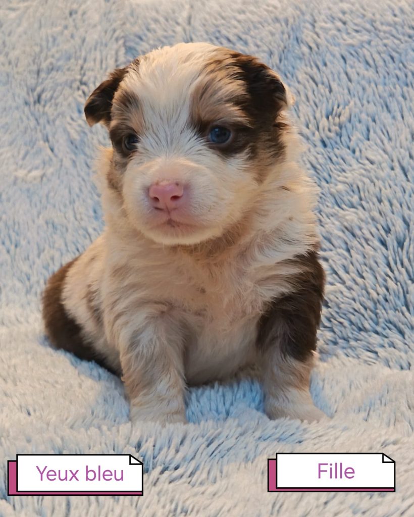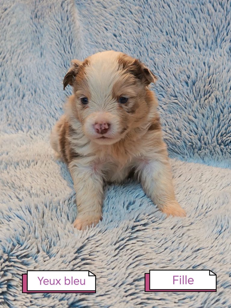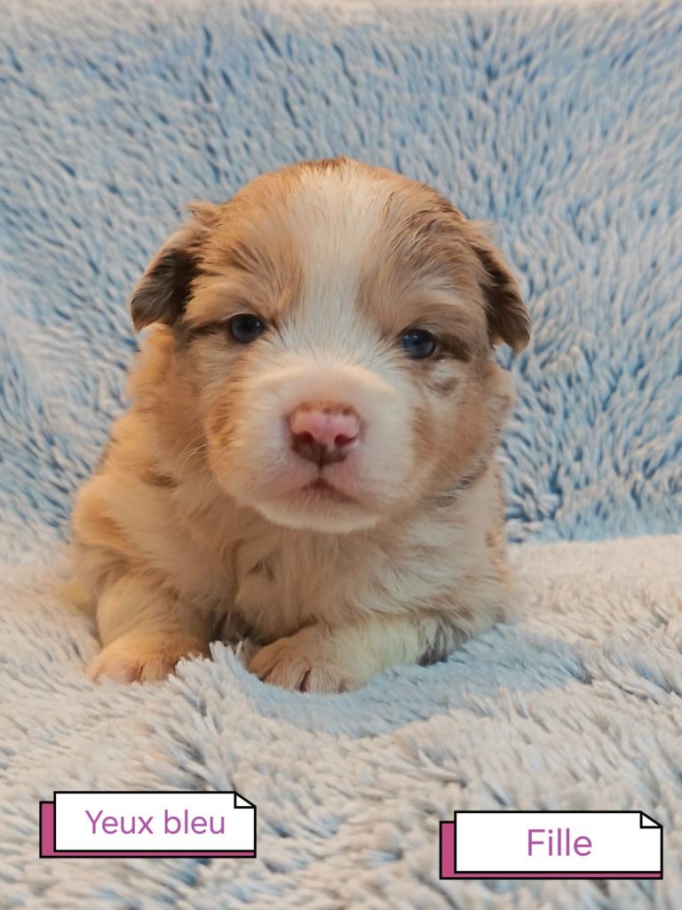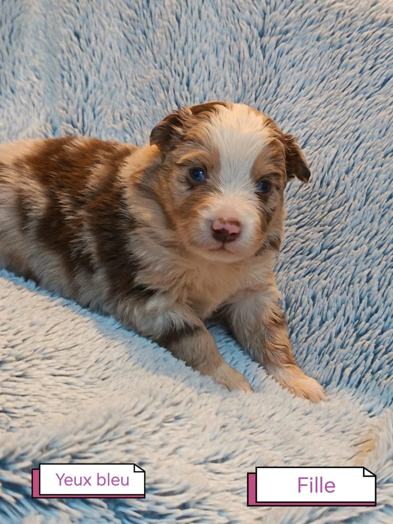 Sexes : 6 femelles et 2 mâlesCouleurs & yeux : 2 Mâles : – 1 rouge tricolore – 1 rouge merle et 6 Femelles : – 5 rouge merle – 1 rouge tricolore