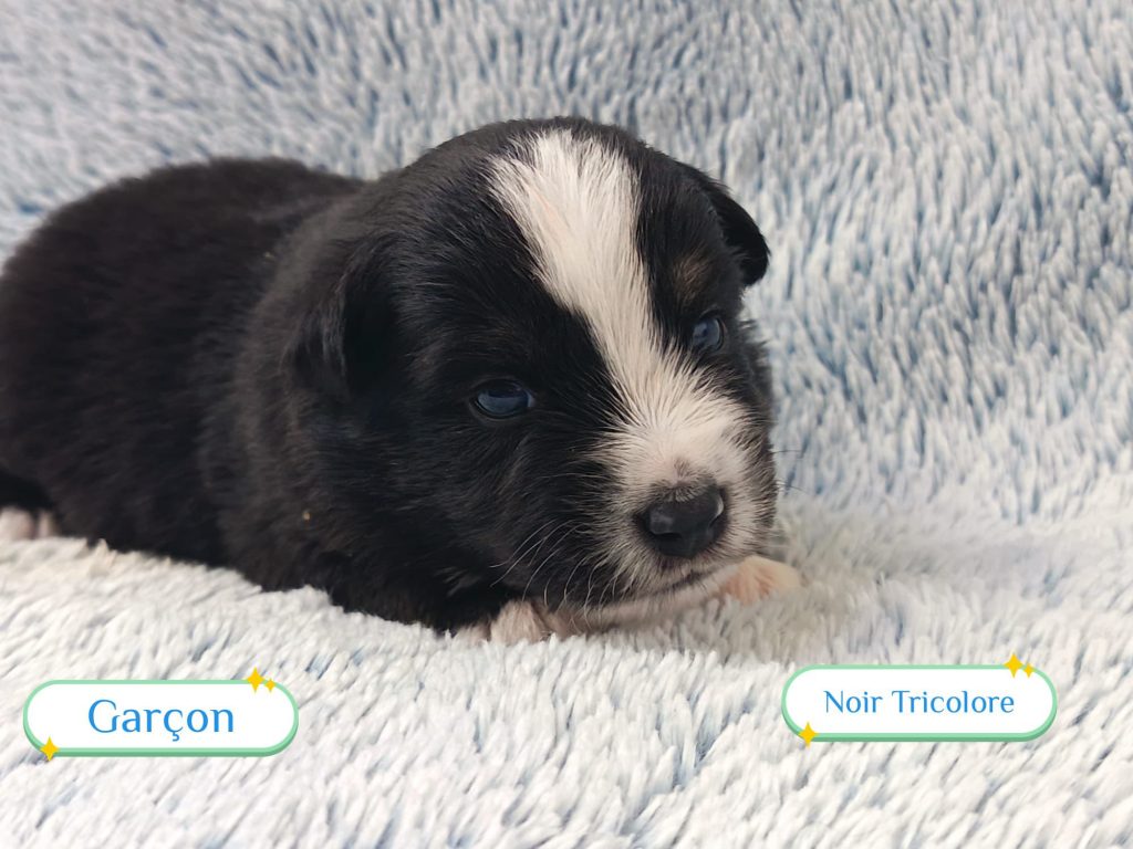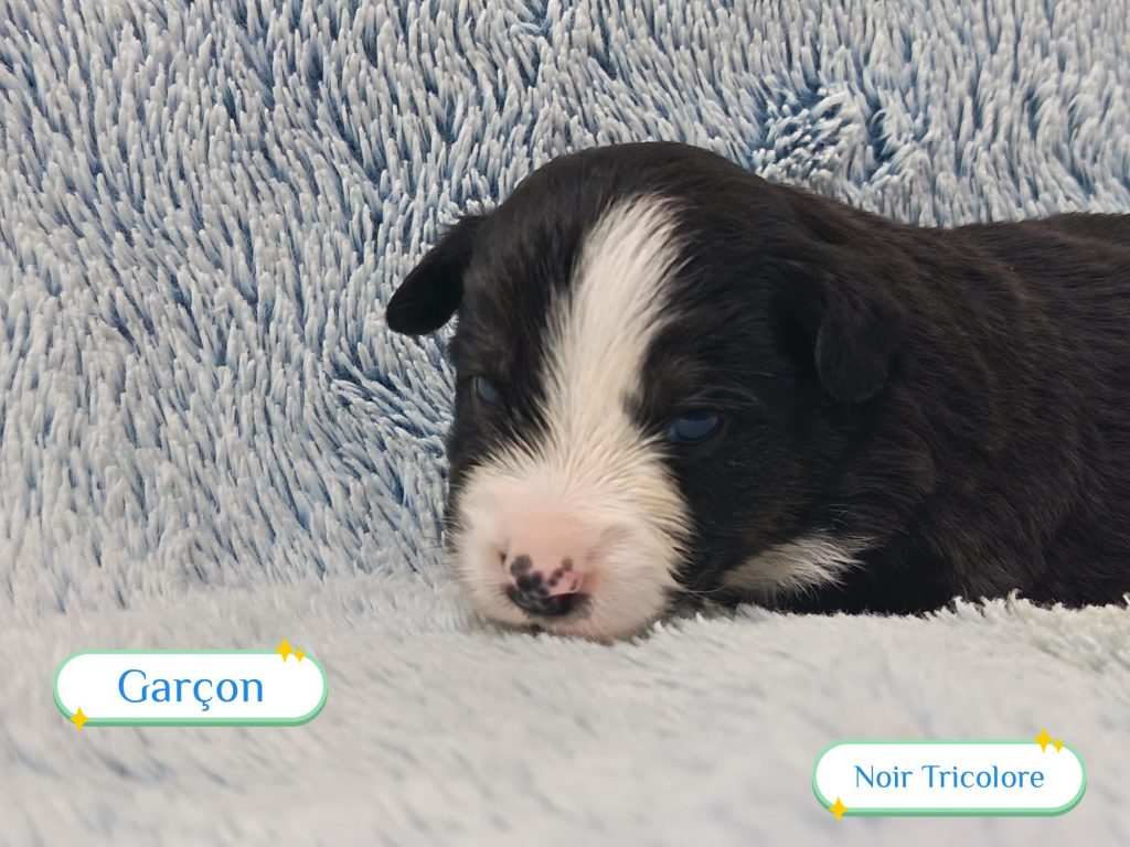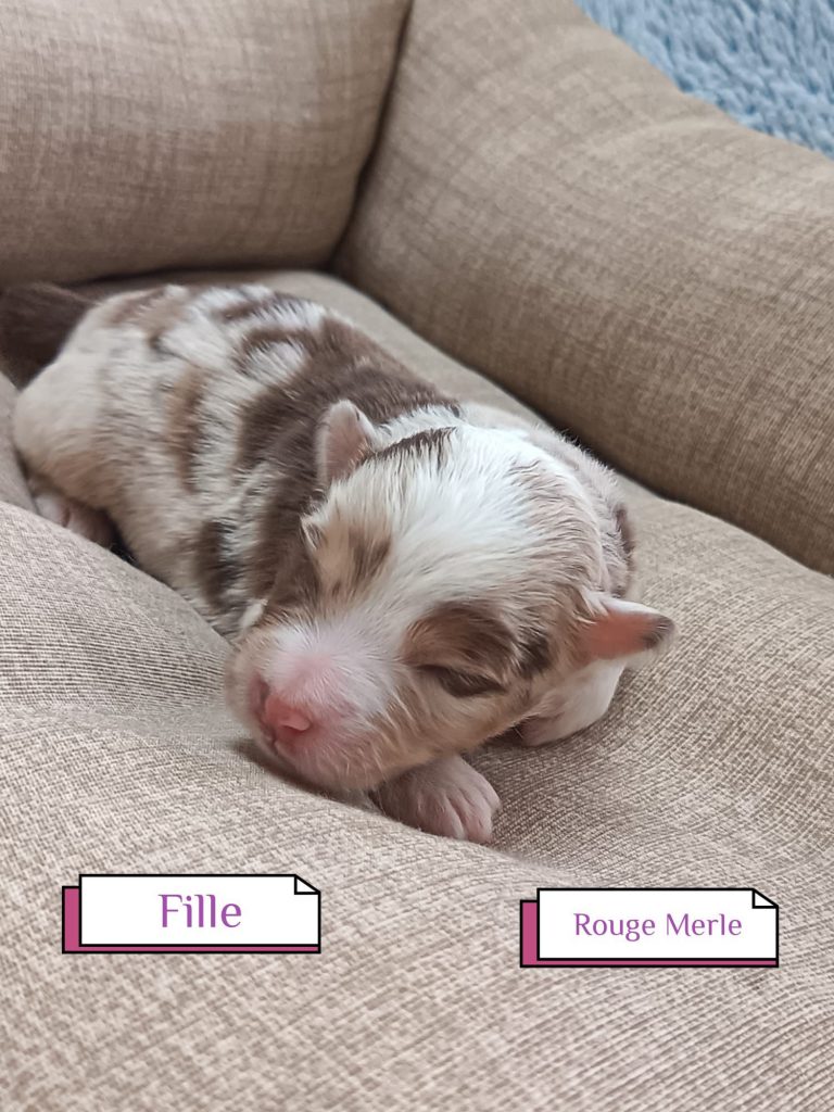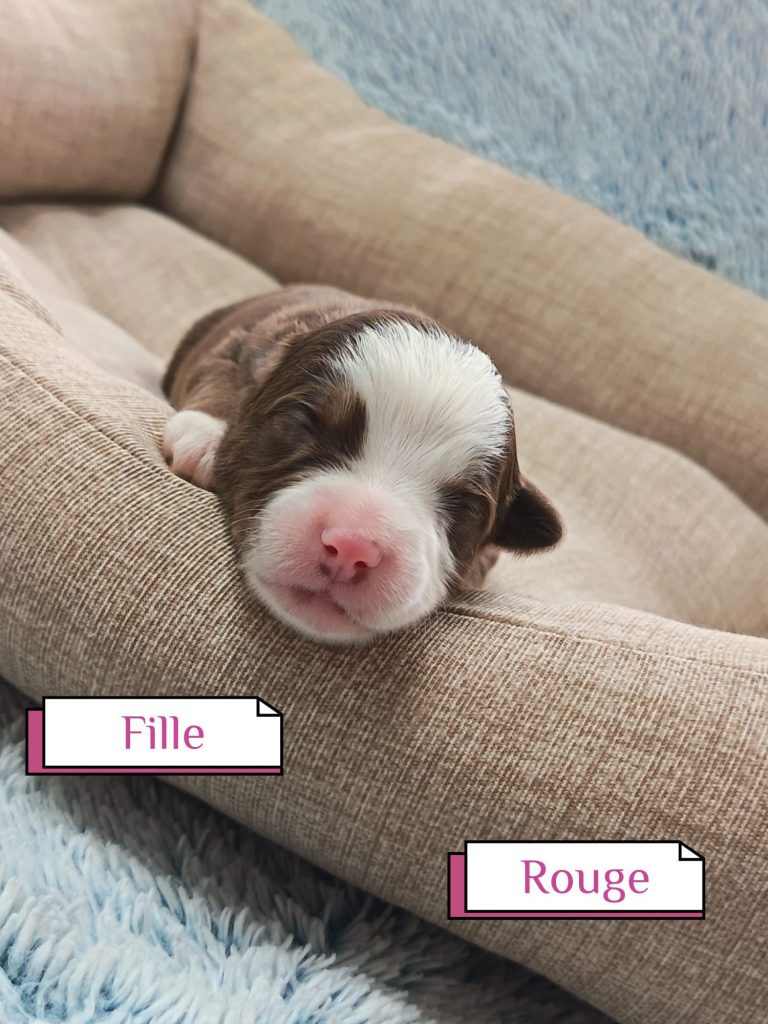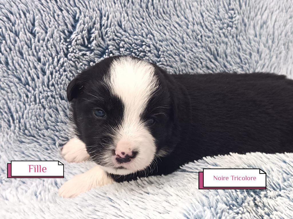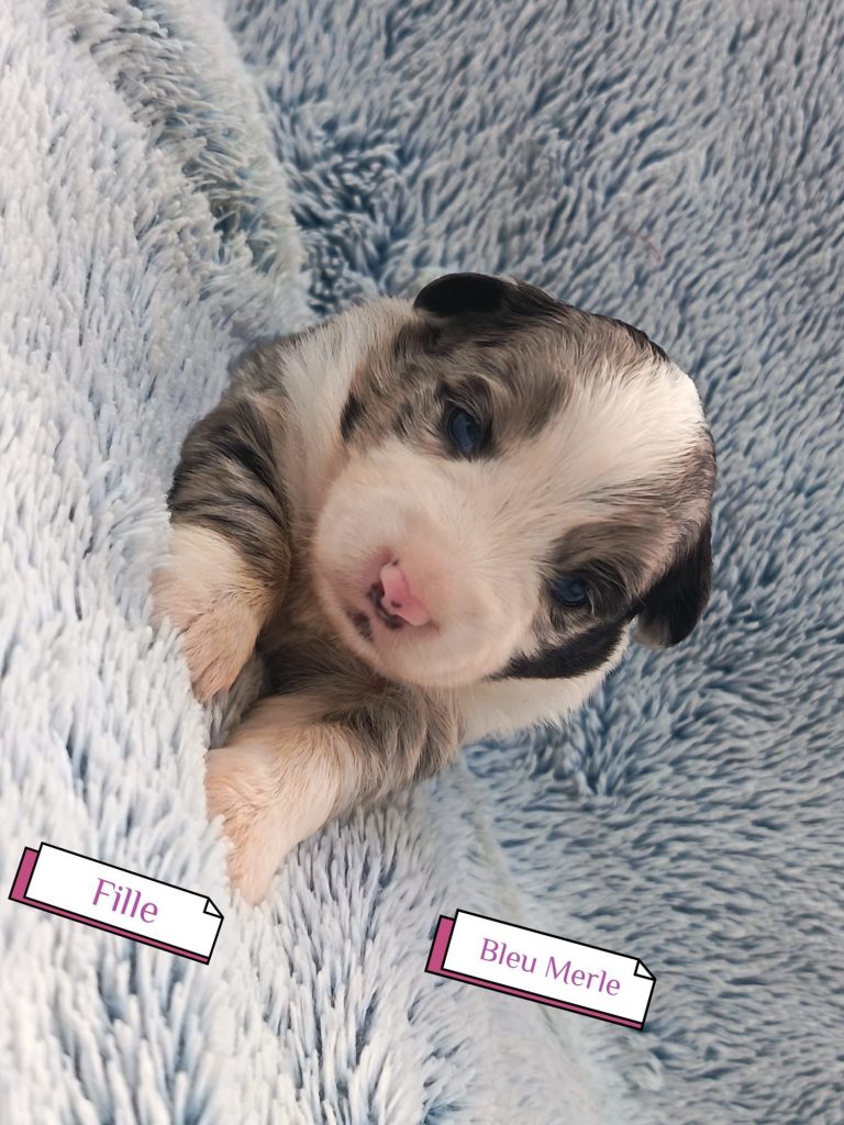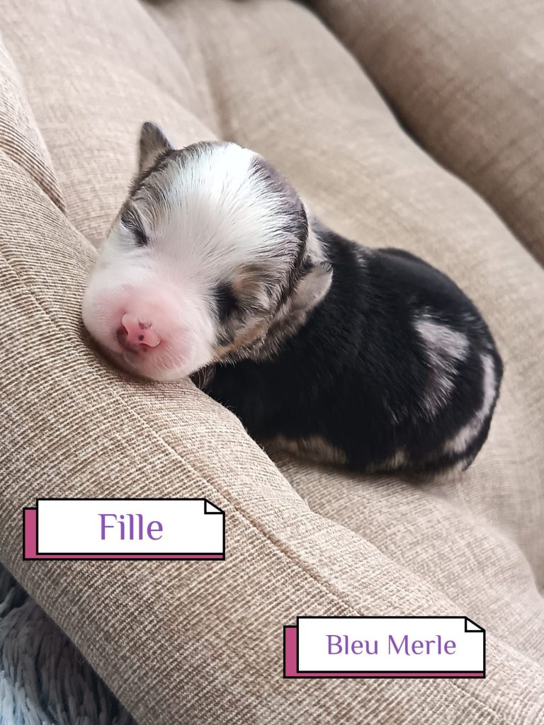 Sexes : 4 femelles et 3 mâlesCouleurs & yeux : 3 Mâles : – 2 noir tricolore – 1 rouge tricolore aux yeux bleus et 4 Femelles : – 1 rouge tricolore – 1 rouge merle – 1 bleu merle – 1 noir tricolore