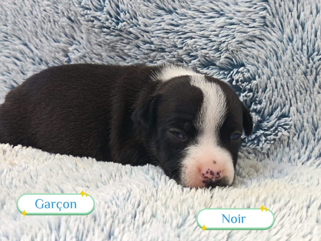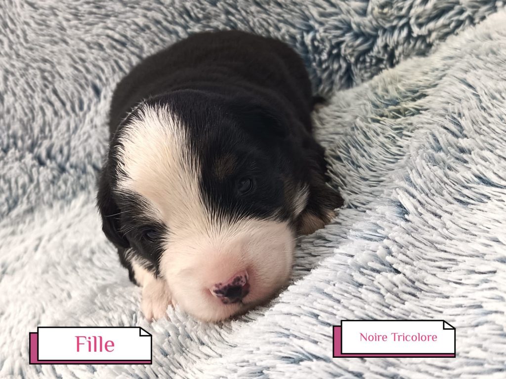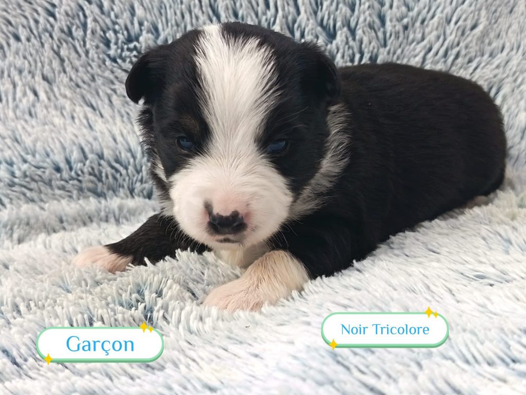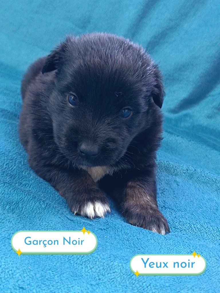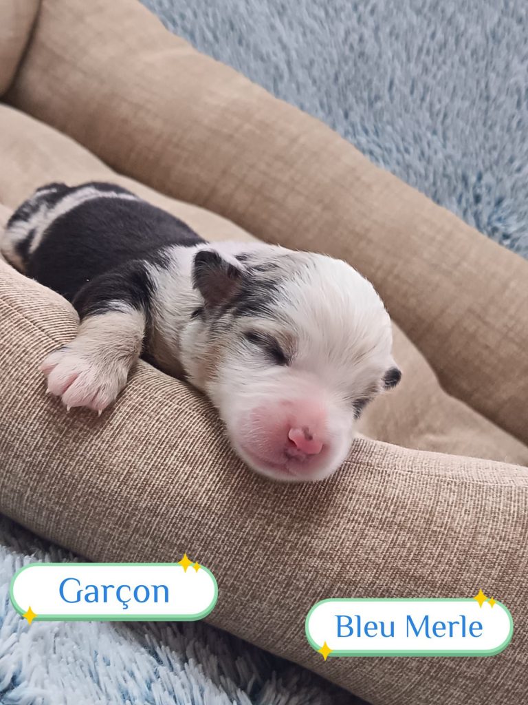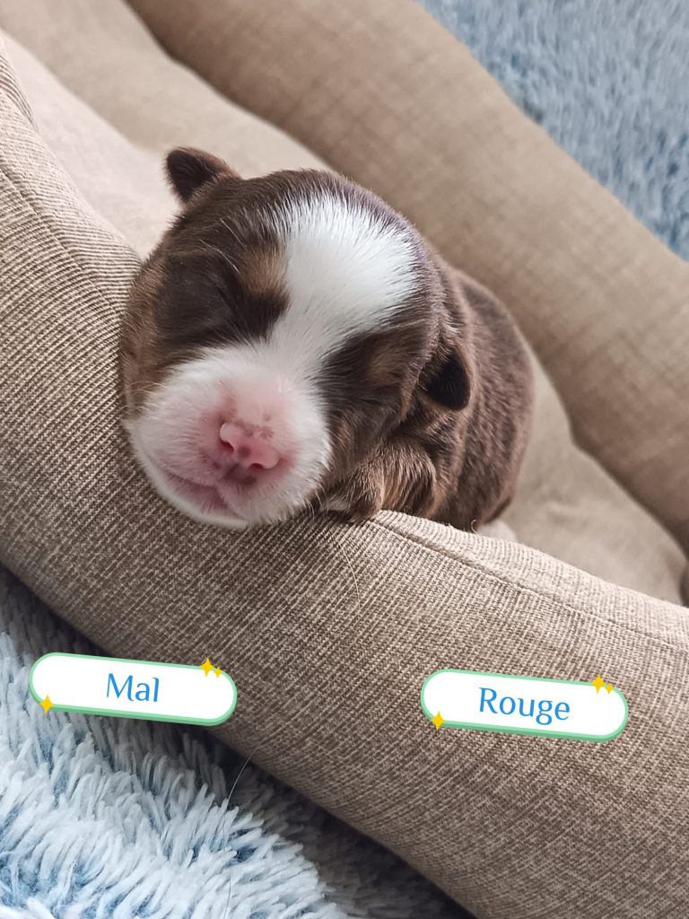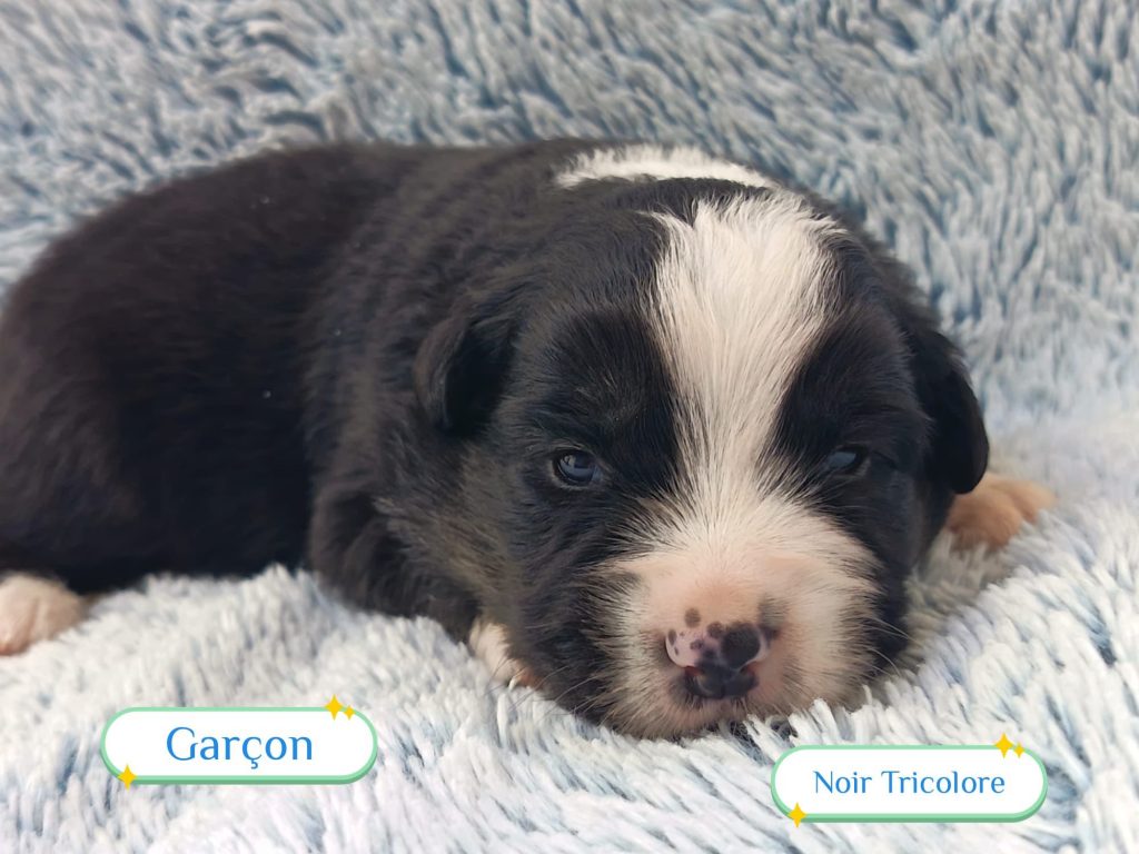 Sexes : 4 femelles et 3 mâlesCouleurs & yeux : 3 Mâles : – 2 noir tricolore – 1 rouge tricolore aux yeux bleus et 4 Femelles : – 1 rouge tricolore – 1 rouge merle – 1 bleu merle – 1 noir tricolore