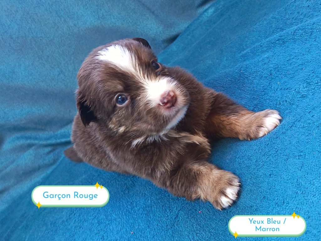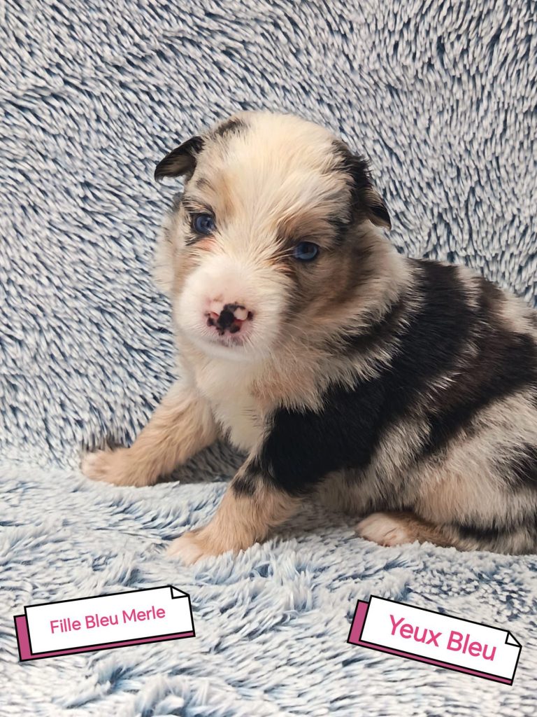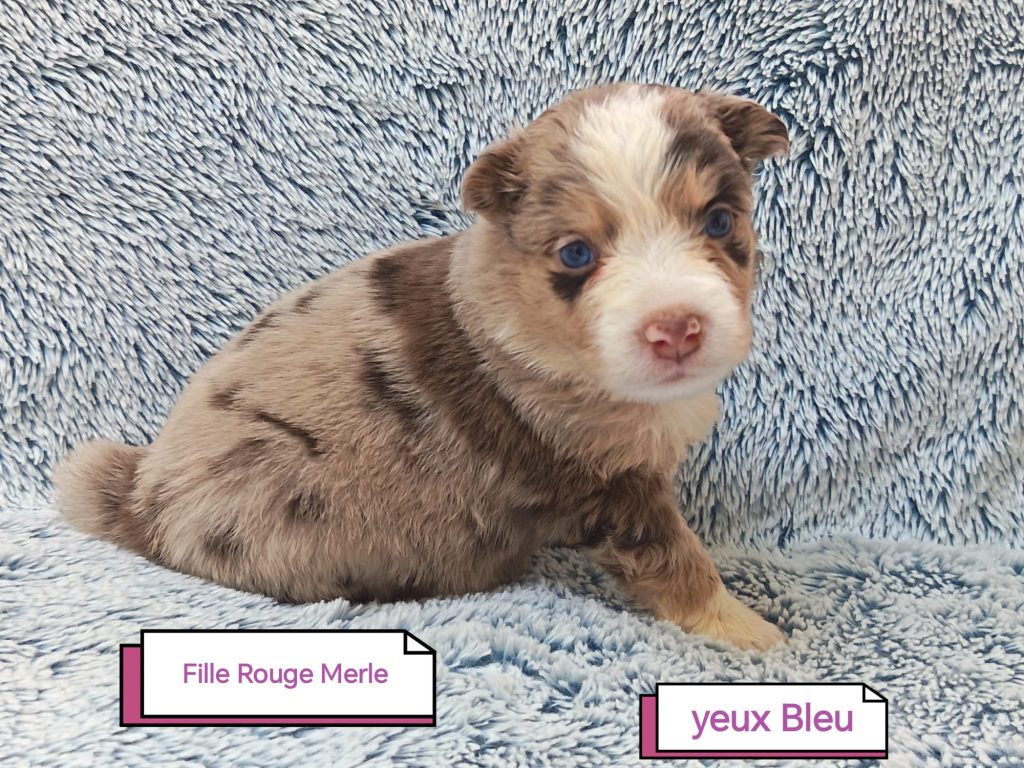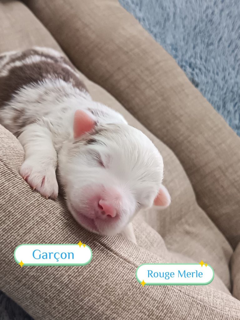 Sexes : 3 mâles et 4 femellesCouleurs & yeux : – 1 femelle bleu merle – 2 femelles rouge tricolore – 1 femelle rouge merle – 1 mâle rouge merle – 1 mâle rouge tricolore – 1 mâle bleu merle