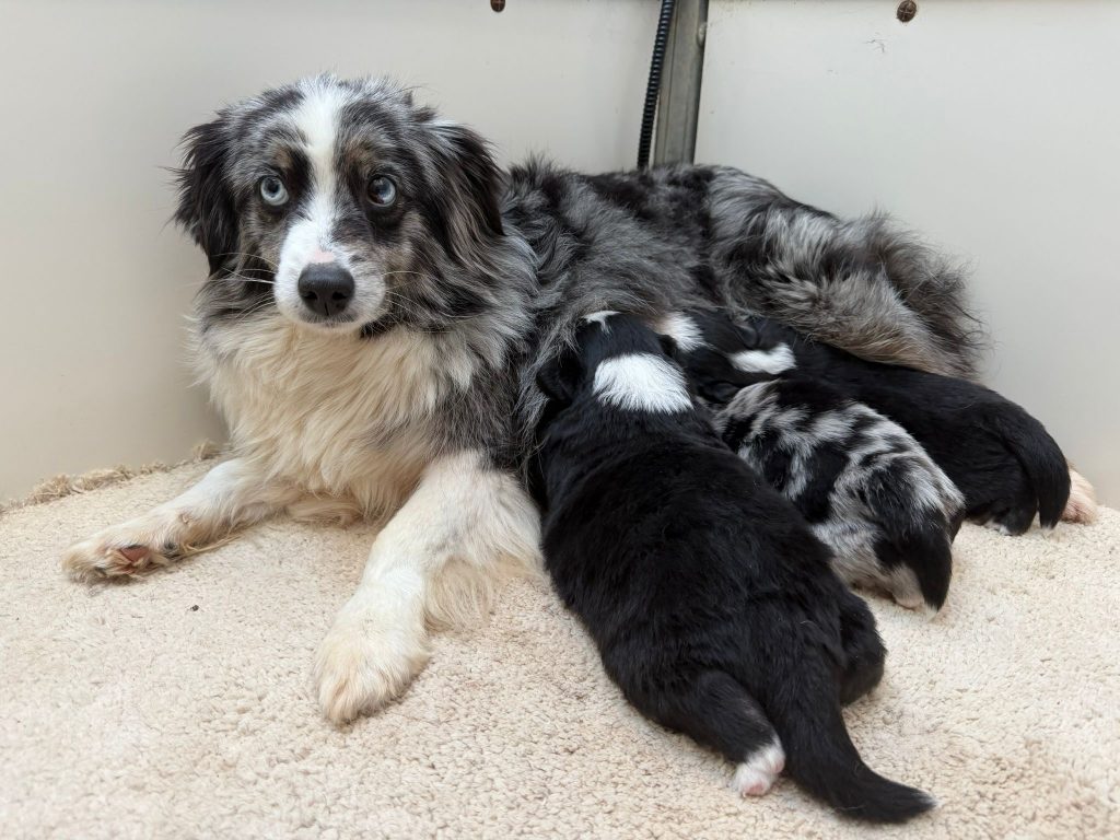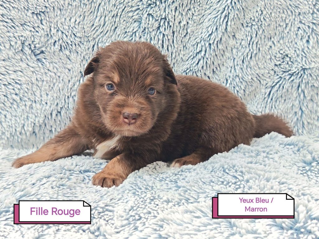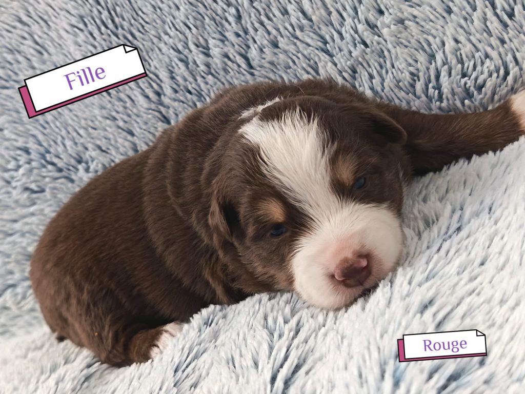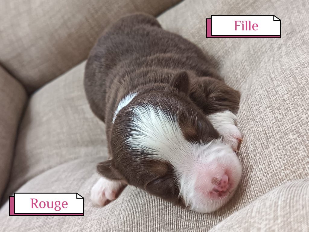 Sexes : 3 mâles et 4 femellesCouleurs & yeux : – 1 femelle bleu merle – 2 femelles rouge tricolore – 1 femelle rouge merle – 1 mâle rouge merle – 1 mâle rouge tricolore – 1 mâle bleu merle